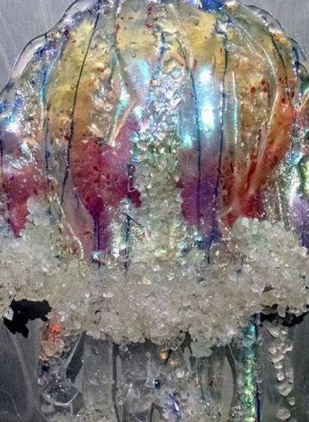 Approximately 22 inches long she is placed upon a brushed aluminum panel and surrounded by Jelly Fish Tentacles (don't they eat Jelly-Fish?) Dichroic Glass