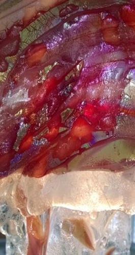 Pimento Red Glass, Kiln Cooked 2 times to achieve texture and character.Notice the Crustacian?Also made in colors of Deep Marine Blues. They sit on Re-Cycled Pallet approximately 10" X 13".